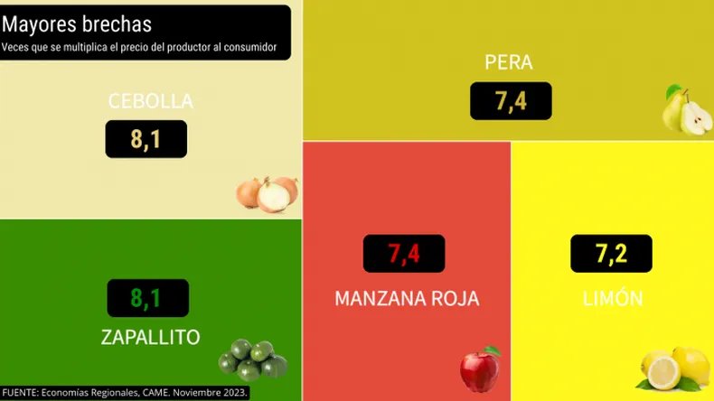 La cebolla (8,1 veces), el zapallito (8,1), la pera (7,4), la manzana roja (7,4) y el limón (7,2), fueron los cinco productos que presentaron mayor diferencia entre los precios de origen y destino.