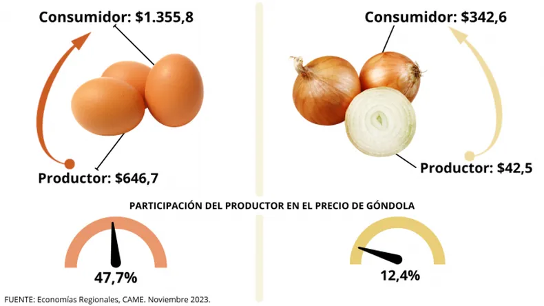 En promedio, la participación del productor explicó el 26,9% de los precios de venta final, mejorando en un 2,6% con relación a octubre. La mayor participación la tuvieron los productores de huevos (47,7%), mientras que la menor fue para los de cebolla (12,4%) —al igual que para los de zapallito—.
