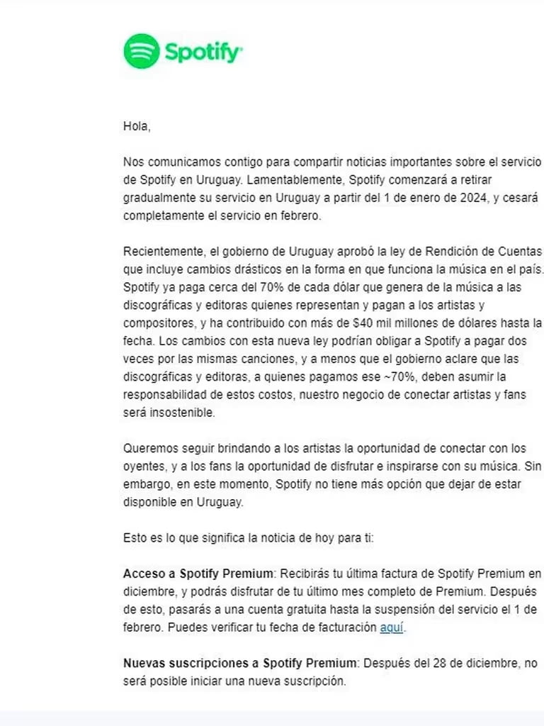 “Nos comunicamos contigo para compartir noticias importantes sobre el servicio de Spotify en Uruguay. Lamentablemente, Spotify comenzará a retirar gradualmente su servicio en Uruguay a partir del 1 de enero de 2024, y cesará completamente el servicio en febrero”, dice el mensaje que recibieron los usuarios.