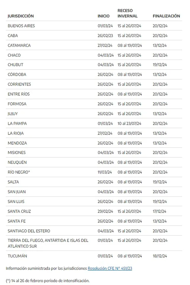Tras la reunión del Consejo Federal de Educación en noviembre de 2023 y luego de conocerse el calendario de feriados nacionales y provinciales, las autoridades definieron las fechas para el inicio escolar 2024 en sus jurisdicciones. Además, se fijaron los días de receso invernal durante julio y el cierre del ciclo lectivo.