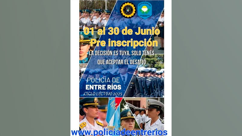 La Dirección Institutos Policiales, dependiente de la Policía de Entre Ríos, informó que, desde el 1° hasta el 30 de Junio de 2024, estarán abiertas las inscripciones para ingresar a las distintas carreras, con régimen de internado, que ofrecen las Escuelas de Policías.