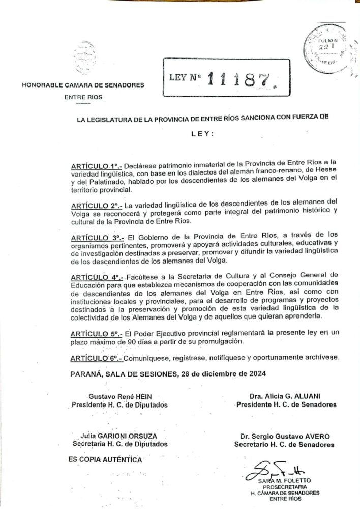 El Boletín Oficial publicó la Ley Nº11187, por la que se declara patrimonio inmaterial de la Provincia de Entre Ríos a la variedad lingüística, con base en los dialectos del alemán franco-renano, de Hesse y del Palatinado, hablado por los descendientes de los alemanes del Volga. Así lo confirmaron desde el municipio de Valle María.