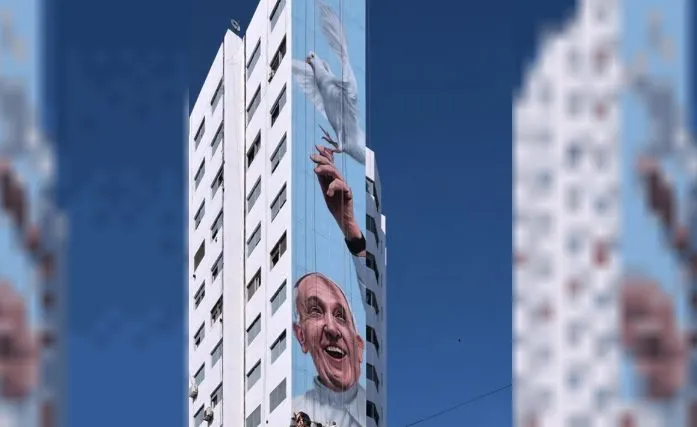 Con el rostro del papa recortado sobre el cielo platense, la imagen impacta no solo por sus dimensiones —abarca toda la fachada lateral de un edificio— sino también por su iluminación. Se instalaron seis reflectores de alta potencia que se encienden al anochecer para mantener visible la obra sin afectar el entorno ni la circulación vial.