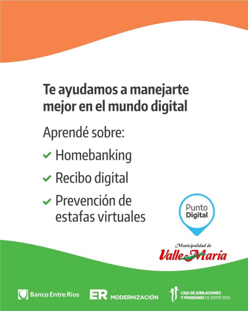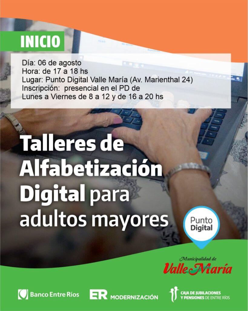 La Municipalidad de Valle María invita a participar del Taller de Alfabetización Digital para Adultos Mayores, una propuesta formativa gratuita orientada a brindar herramientas básicas para el uso seguro y autónomo de la tecnología en la vida cotidiana.