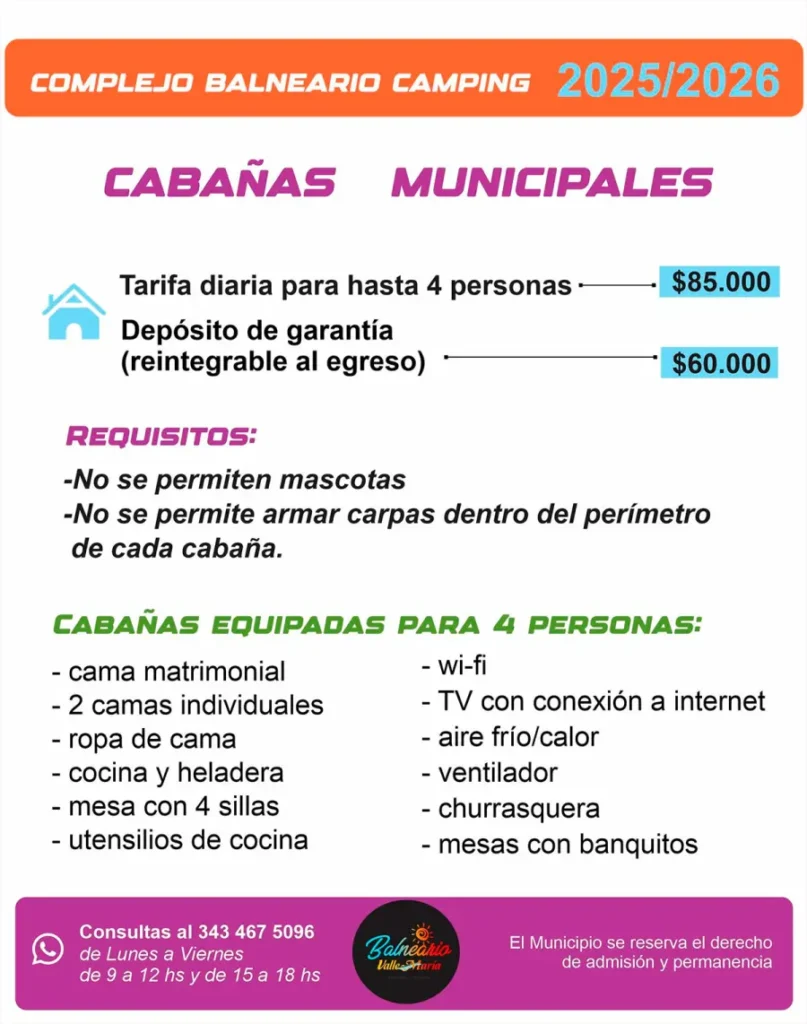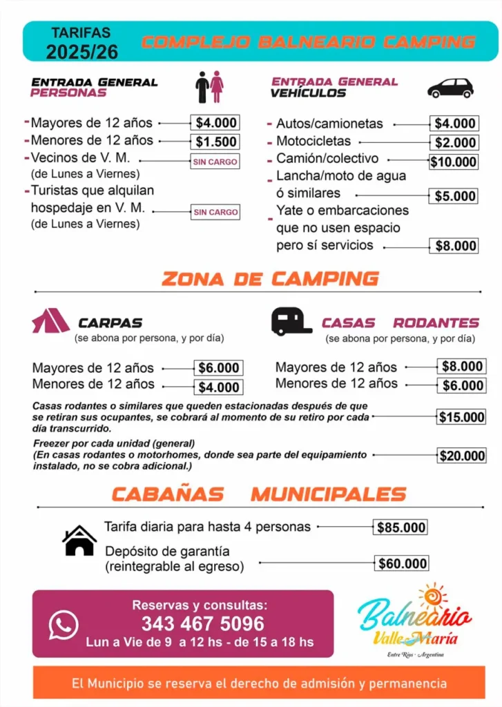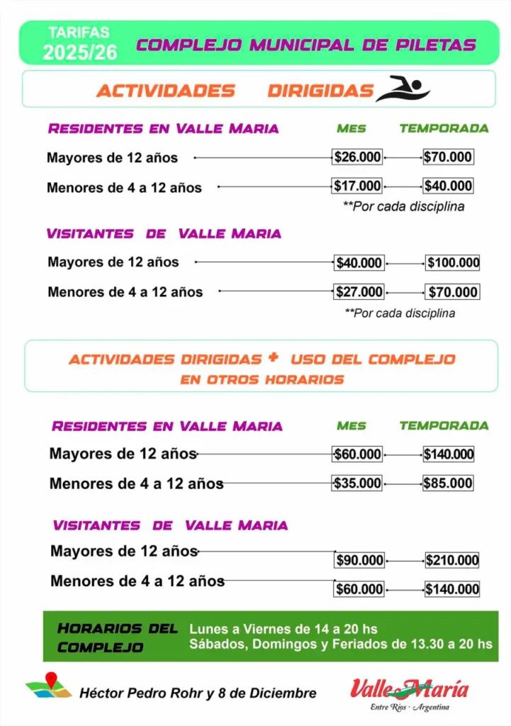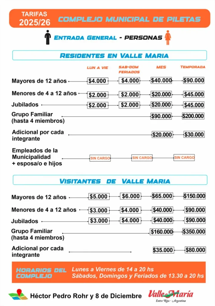 La Municipalidad de Valle María dejó habilitados el Complejo Balneario Camping y el Complejo Municipal de Piletas para la temporada de verano 2025/2026. Desde este viernes rigen las nuevas tarifas, que se exhiben en los accesos a cada complejo y también están disponibles en los canales oficiales de comunicación del municipio.